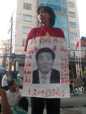 * H́nh ảnh dân oan cầm biểu ngữ tố cáo Bí thư tỉnh Lâm Đồng Huỳnh Đức Ḥa