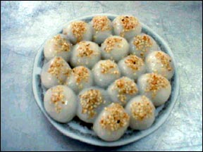 Ðậu xanh ngâm 1 đêm hấp chín tán nhuyễn để khoãng 1 1/2 muổng càfê muối vào xào đều tay với một ít nước cốt dừa + 1 1/2 muổng càfê đường + 1 muổng càfê tiêu cho dẽo rồi để nguội, vo viên tròn bằng ngón chân cái để riêng