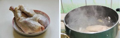 Gà sau khi sơ chế, rửa sạch, bỏ vào nồi. Thêm nước xâm xấp mặt gà rồi bắc lên bếp. Thêm hành lá, nhánh gừng đập giập, chút xíu muối và 1 muỗng canh rượu trắng.