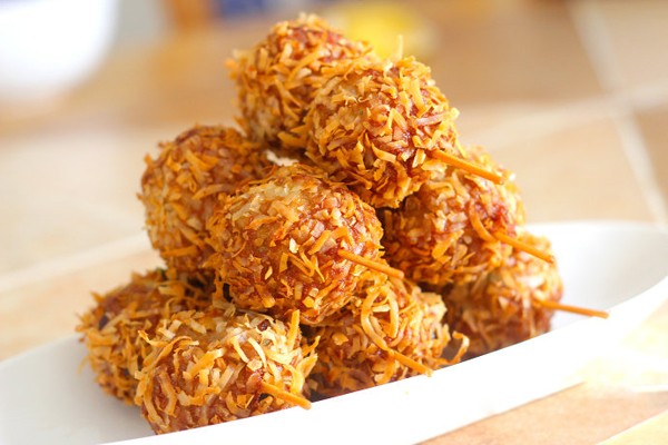 Thịt viên với trứng muối đậm đà, kèm theo lớp vỏ dừa sấy giòn rụm ngon ngon, hẳn bạn sẽ thích lắm luôn!