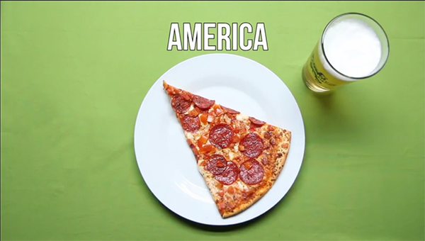 Người Mỹ uống bia với một miếng bánh Pizza.