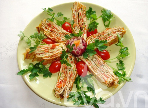 Bước 6: Bày trứng ra đĩa. Trang trí rau, củ, quả. Có thể bày cả miếng hình bán nguyệt ra đĩa. Có thể cắt thành từng miếng cỡ 2 cm, rồi lật lật ngang miếng trứngđặt lên đĩa. Sẽ thấy nhiều lớp xen kẽ, rất đẹp mắt.