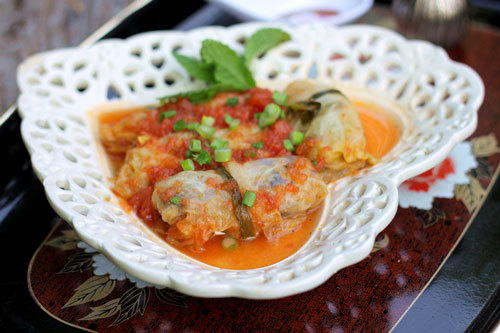 Lá bắp cải ngọt cuộn hỗn hợp thịt, mộc nhĩ, miến giòn giòn hấp chín rồi sốt qua cà chua, ăn đậm đà, hấp dẫn.