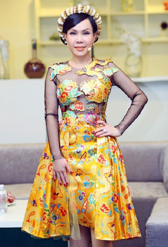 Chiếc đầm long phượng được thiết kế song song hài hòa giữa truyền thống và hiện đại. Bộ cánh được may thành váy xòe ngắn phù hợp và cân đối với vóc dáng của chị. Mặc dù màu sắc rực rỡ nhưng không hề riêm rúa. Họa tiết và đường nét trang phục không vượt quá giới hạn “sến sẩm”, giúp nữ giám khảo trở nên đẹp tinh tế và thuần Việt hơn.
