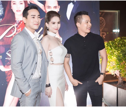 Ngọc Trinh duyên dáng bên "soái ca" Hứa Vĩ Văn và ông bầu Vũ Khắc Tiệp.