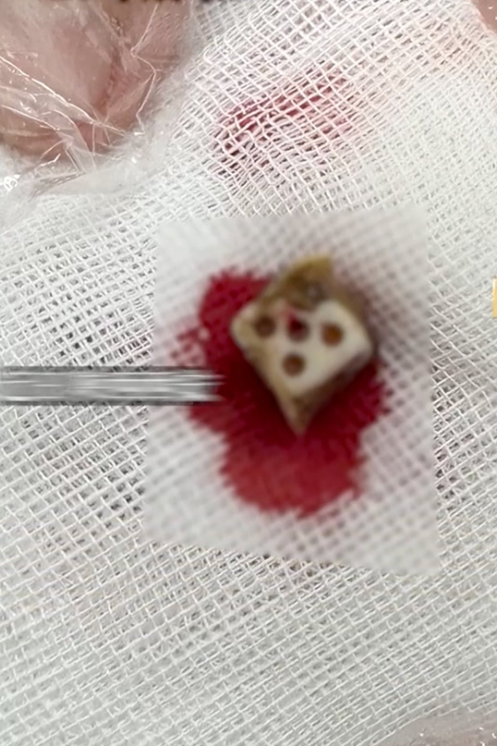 “Trong quá trình nội soi mũi, chúng tôi phát hiện ra vật lạ là một cục màu trắng phủ đầy dịch tiết. Khi lấy ra, vật lạ hóa ra là một khối vuông dài 2 cm, bị ăn mòn một phần do kẹt trong khoang mũi trong thời gian dài. Vật này đã gây tổn thương niêm mạc mũi”, bác sĩ Dương giải thích.