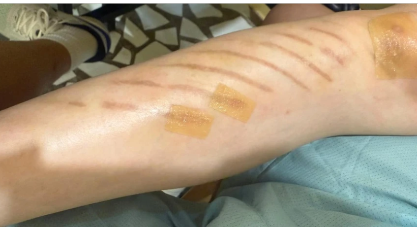 Hari Won bị thương khi đi thang cuốn và mang theo hành lý. Nữ ca sĩ trầy xước khắp chân.