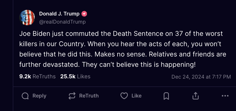 Phản ứng đầu tiên của Tổng thống đắc cử Mỹ Donald Trump sau khi biết ông Biden quyết định giảm án cho 37 phạm nhân chờ thực thi án tử hình. Ảnh chụp màn hình bài đăng trên mạng xã hội Truth Social của Tổng thống đắc cử Mỹ Donald Trump