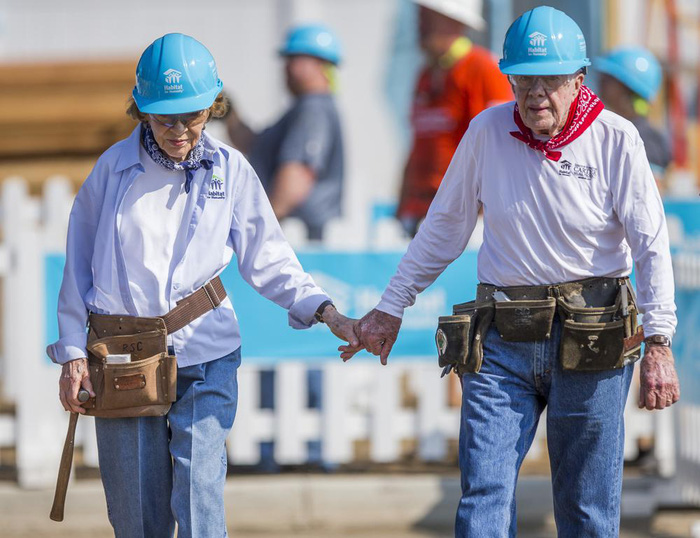 Cựu Tổng thống Jimmy Carter nắm tay vợ, cựu đệ nhất phu nhân Rosalynn Carter khi làm việc với các tình nguyện viên khác trong ngày đầu tiên của Dự án Jimmy & Rosalynn Carter Work ở Mishawaka, Ấn Độ vào ngày 27/08/2018. Ảnh: AP