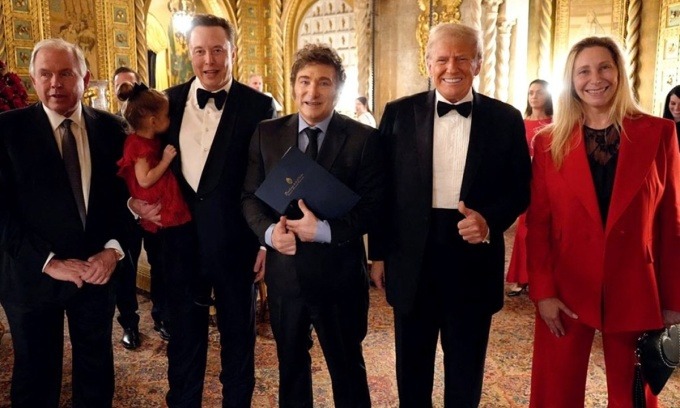 Elon Musk (thứ hai từ trái sang) chụp ảnh chung với ông Trump (thứ 4 từ trái sang) và Tổng thống Argentina Javie Milei (giữa) tại Mar-a-Lago hôm 14/11. Ảnh: AFP