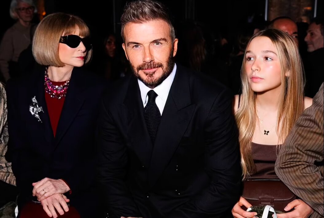 Ngồi hàng ghế đầu, Harper Beckham nép sau bố và có vẻ căng thẳng trước sự quan tâm của các tay săn ảnh. Ngồi cạnh gia đình Beckham là Anna Wintour - nhân vật quyền lực của Vogue. Các con trai của Beckham cũng diện suit bảnh bao không thua kém người bố nổi tiếng.
