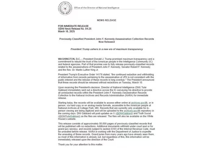 Ngay sau khi nhậm chức vào tháng 1, Tổng thống Trump đã thực hiện hành động hành pháp để thiết lập một quy trình giải mật và công bố mọi tài liệu còn lại liên quan đến vụ ám sát Kennedy, cũng như vụ ám sát Robert F. Kennedy và Martin Luther King Jr.