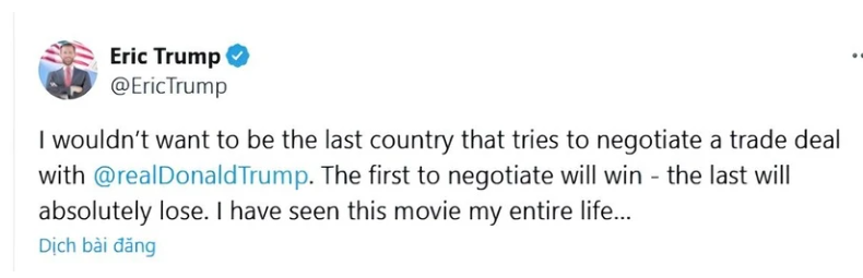 "Tôi sẽ không muốn là quốc gia cuối cùng ngồi vào bàn đàm phán với @RealDonaldTrump. Ai đàm phán trước sẽ thắng - ai chần chừ sẽ chắc chắn thua. Tôi đã chứng kiến điều này cả đời mình", Eric Trump viết.
