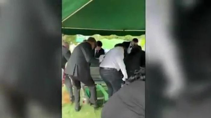 Đoạn video ghi lại khoảnh khắc, nhóm người khiêng quan tài bất ngờ rơi xuống huyệt mộ cùng chiếc quan tài, khiến nhiều người chứng kiến bàng hoàng.
