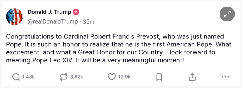 Trong bài đăng trên mạng xă hội Truth Social, Tổng thống Trump viết: "Xin chúc mừng Đức Hồng y Robert Francis Prevost, người vừa được phong làm Giáo hoàng. Thật vinh dự khi biết rằng ngài là Giáo hoàng người Mỹ đầu tiên. Thật phấn khích và thật là Vinh dự lớn cho Đất nước chúng ta. Tôi mong được gặp Giáo hoàng Leo XIV. Đó sẽ là một khoảnh khắc rất ư nghĩa!"