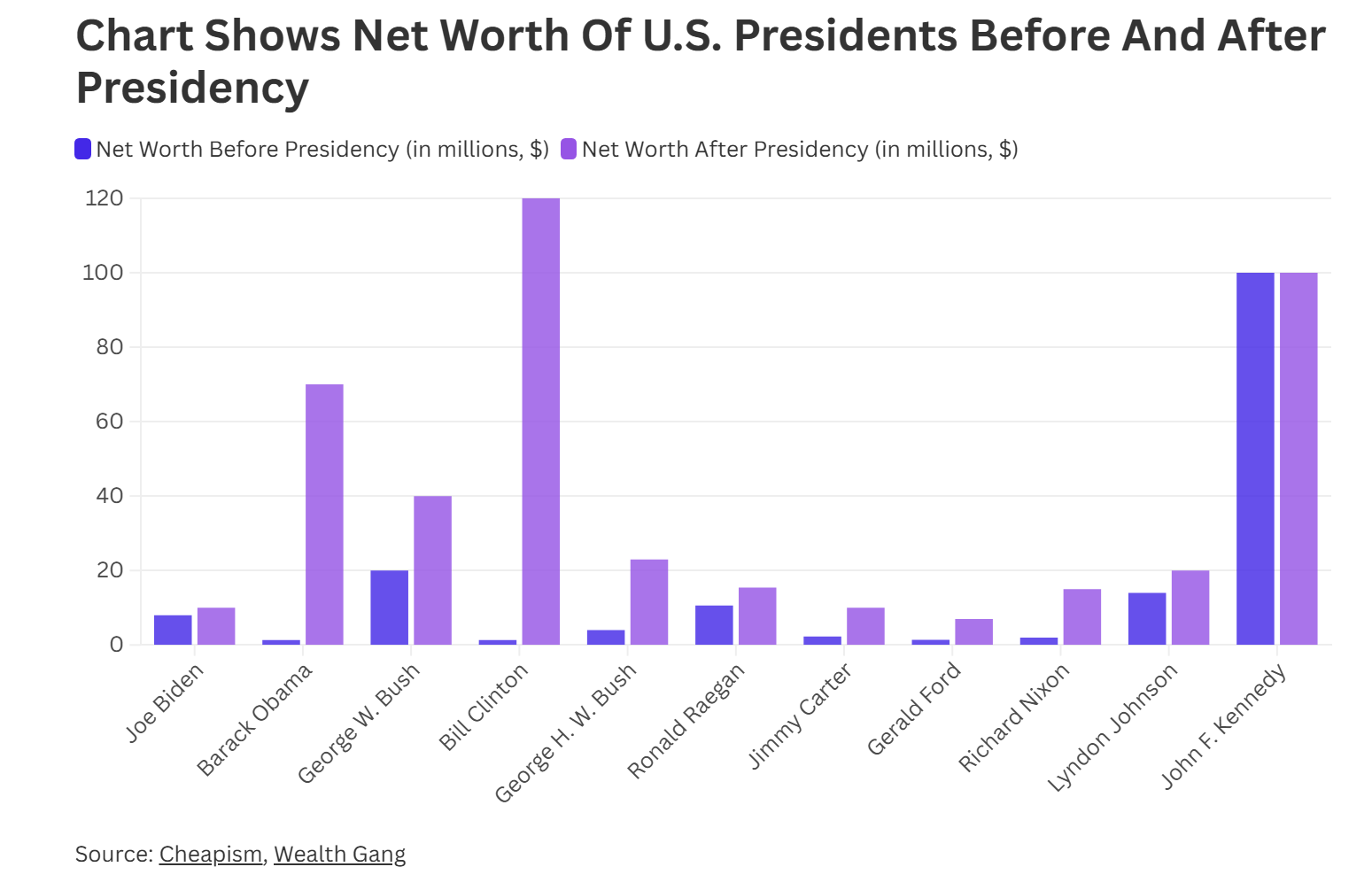 Mặc dù vậy, vị tổng thống có giá trị tài sản ṛng cao thứ hai sau khi rời nhiệm sở là John F. Kennedy, một đảng viên Dân chủ tại nhiệm từ năm 1961 đến năm 1963.