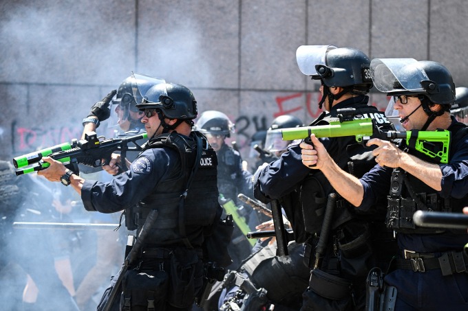 Cảnh sát Los Angeles ứng phó người biểu tình bên ngoài một tòa nhà liên bang hôm 10/6. Ảnh: AFP