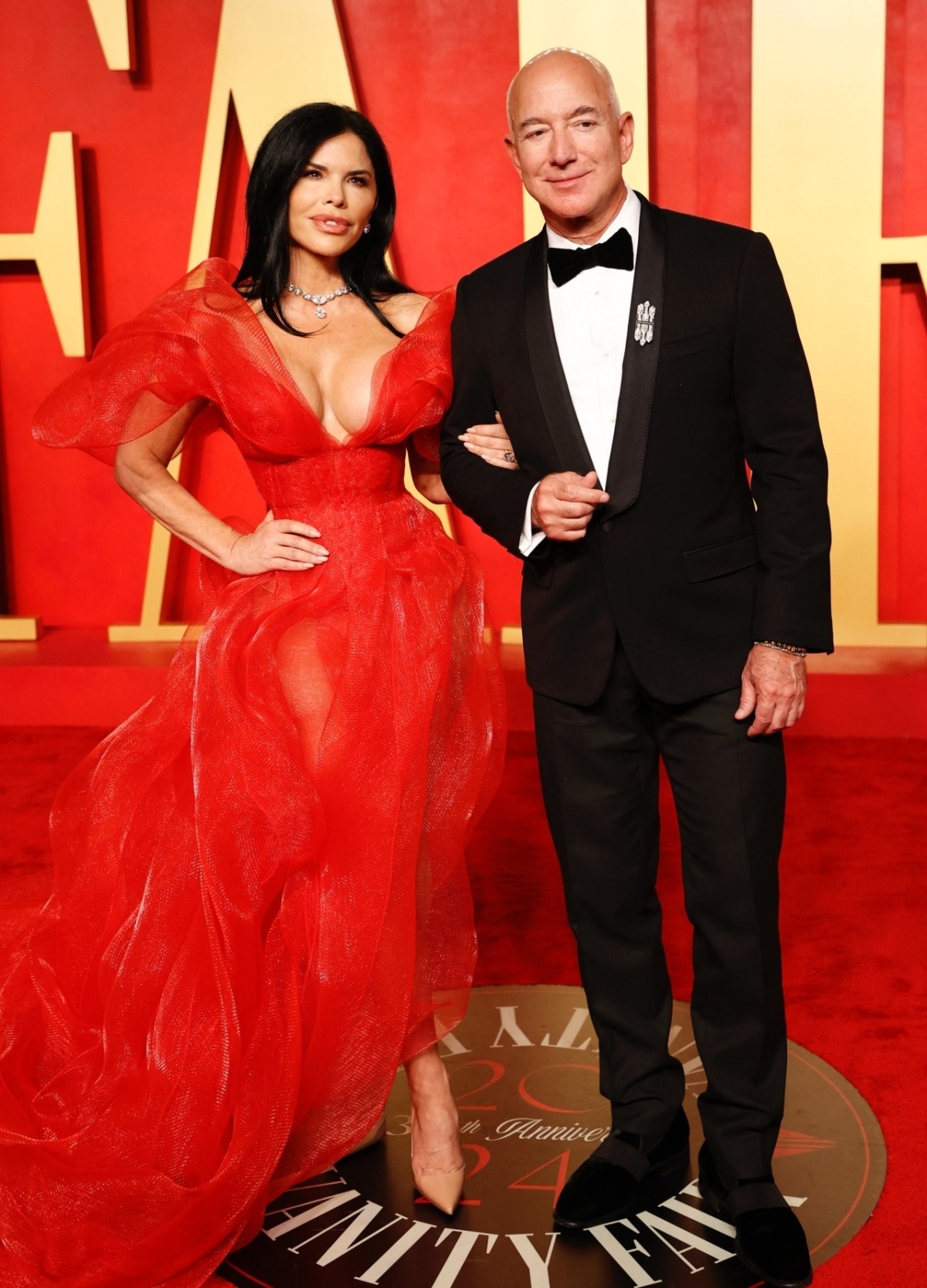Tối 2/3 ở Beverly Hills, họ tới tiệc hậu Oscar tại Trung tâm biểu diễn nghệ thuật Wallis Annenberg. Lauren Sánchez vào nhóm sao mặc đẹp do Vogue chọn với đầm cưới taffeta dáng đuôi cá đính lông vũ, phối vòng cổ ngọc lục bảo. Tỷ phú công nghệ chọn bộ cánh thanh lịch xen phá cách bằng vest nhung phối quần Tây. Ảnh: AFP
