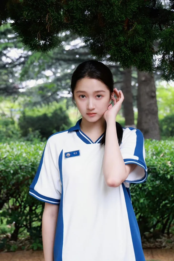 Trong bộ đồng phục học sinh đơn giản, Quan Hiểu Đồng ghi điểm với làn da mịn màng, đôi mắt to tròn cùng biểu cảm đáng yêu không khác gì thiếu nữ tuổi đôi mươi. Hình ảnh này khiến cư dân mạng không khỏi xuýt xoa trước nhan sắc "hack tuổi" ấn tượng của nàng "em gái quốc dân".