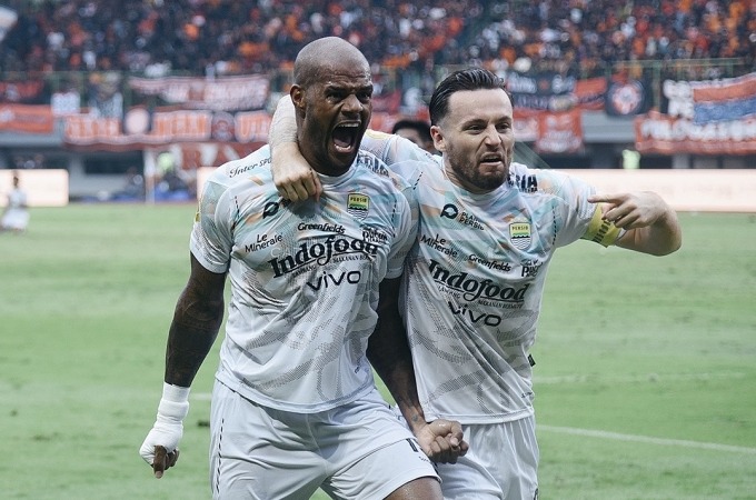 Tiền đạo Brazil David da Silva (trái) mừng bàn gỡ 2-2 cho Persib Bandung trước Persija Jakarta ở giải VĐQG Indonesia Liga 1 2024-2025, tại sân Patriot, Indonesia ngày 16/2/2025. Ảnh: Persib