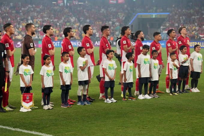 Các cầu thủ Indonesia chào cờ trước trận thua Australia 1-5 ở lượt bảy bảng C vòng loại ba World Cup 2026 - khu vực châu Á, tại sân Allianz Sydney, Australia ngày 20/3/2025. Ảnh: AP