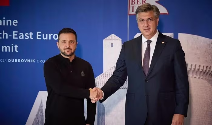Tổng thống Ukraine Volodymyr Zelensky (trái) và Thủ tướng Croatia Andrej Plenkovic tại Dubrovnik, Croatia vào ngày 9/10/2024. (Ảnh: Văn phòng Tổng thống Ukraine)