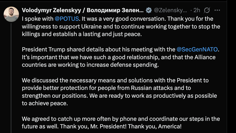 Bài đăng trên mạng xã hội X của Tổng thống Ukraine Volodymyr Zelensky về cuộc điện đàm với Tổng thống Mỹ Donald Trump. Ảnh chụp màn hình