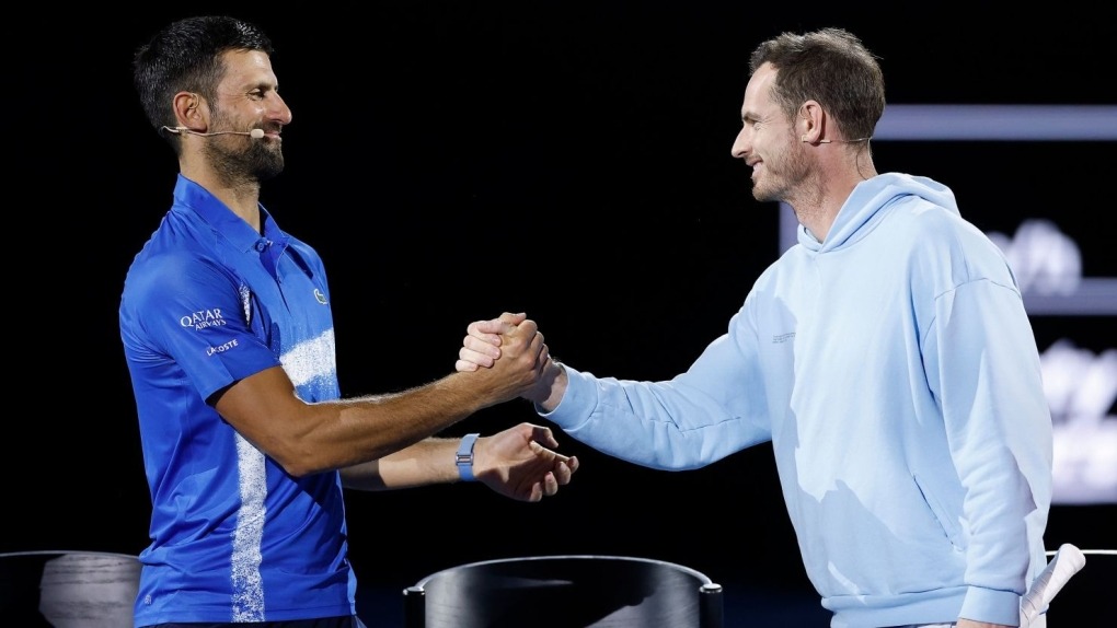 Djokovic (trái) và Murray trong một buổi giao lưu trước thềm Australia Mở rộng 2025, tại sân Rod Laver, Melbourne, Australia. Ảnh: Reuters