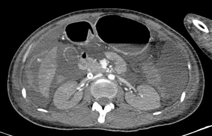Dịch ổ bụng lượng nhiều, nghi ngờ chảy máu ổ bụng trên phim chụp cắt lớp vi tính. Ảnh: BVCC