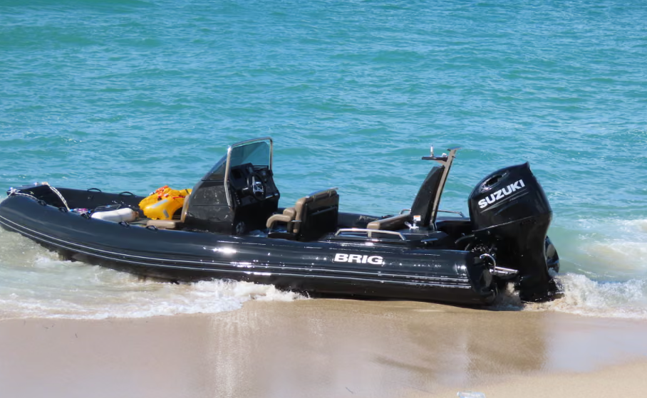 Chiếc RHIB được sử dụng trong chiến dịch buôn lậu bất thành trên bãi biển Gwynver. Ảnh: Cơ quan Phòng chống Tội phạm Quốc gia Anh