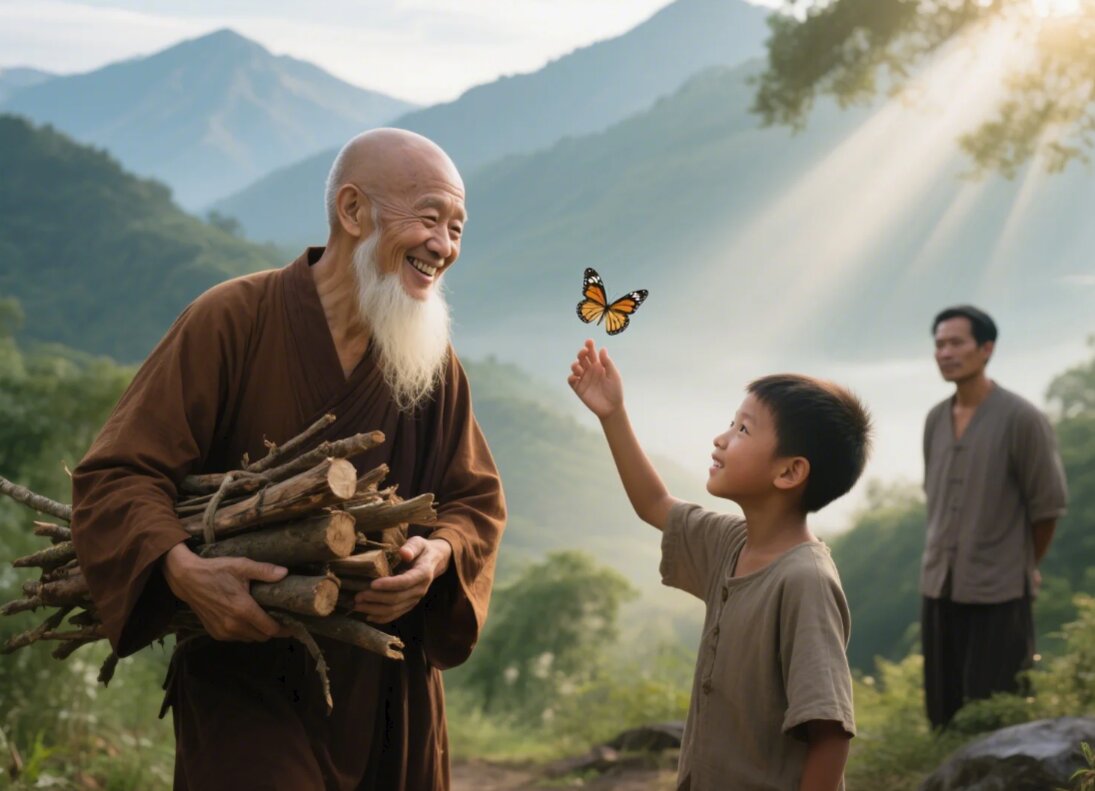 Một vị sư đi từ trên núi xuống bỗng gặp 1 cậu bé đang đuổi theo đàn bướm để bắt