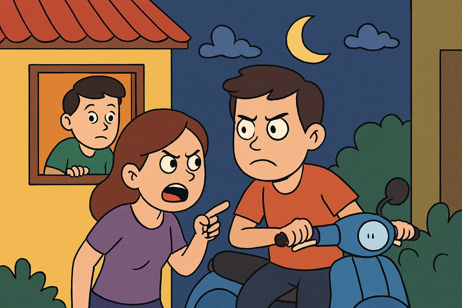 Vợ chồng ông hàng xóm cãi nhau một hồi, rồi anh chồng dắt xe đi. Chị vợ hỏi với theo: