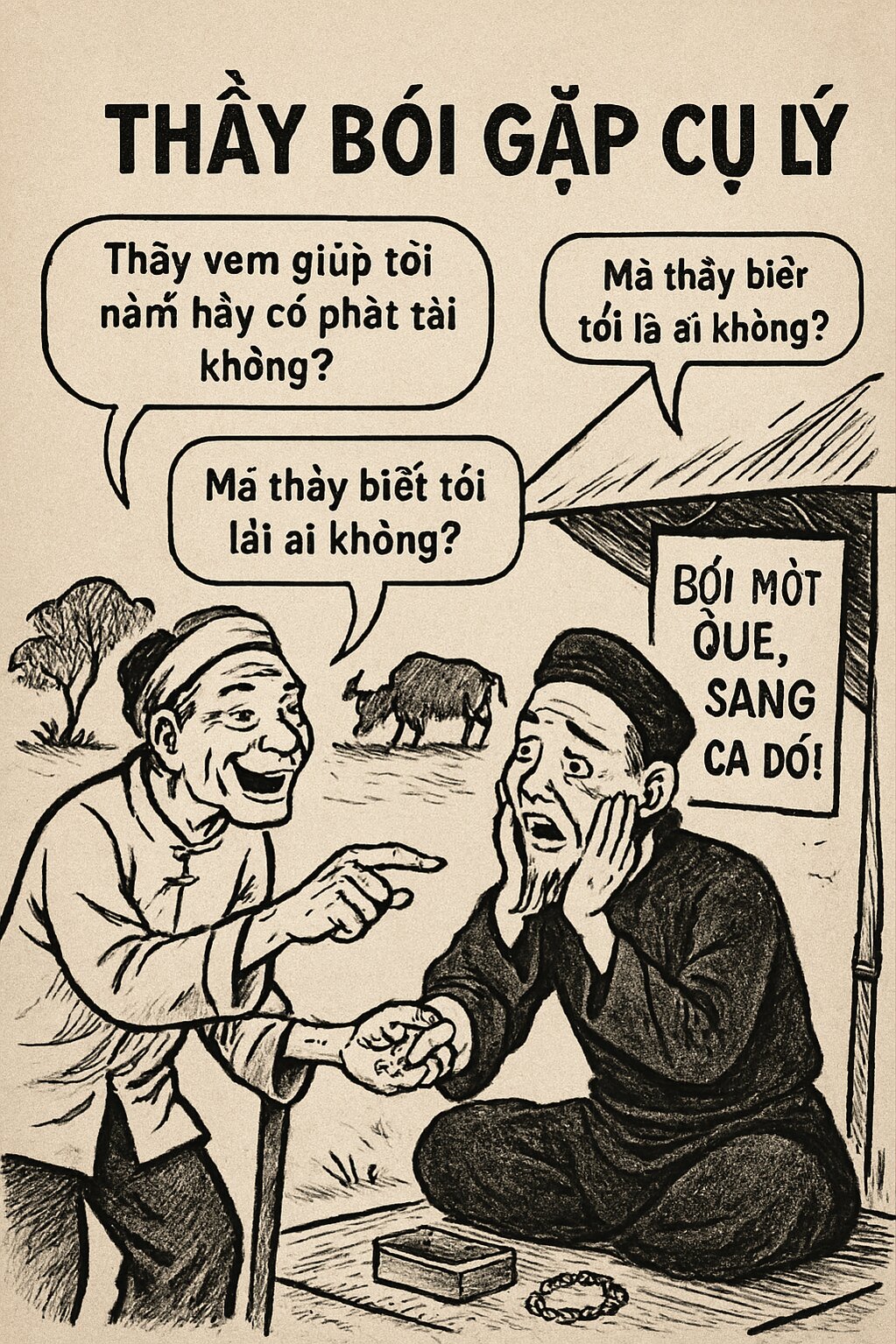 Ngày xưa ở làng Đông Xá có một ông thầy bói nổi tiếng “nói đâu trúng đó” — trừ khi… nói sai. Một hôm, ông đến làng, dựng lều ngay đầu chợ, treo biển: “Bói một quẻ, sáng cả đời!”