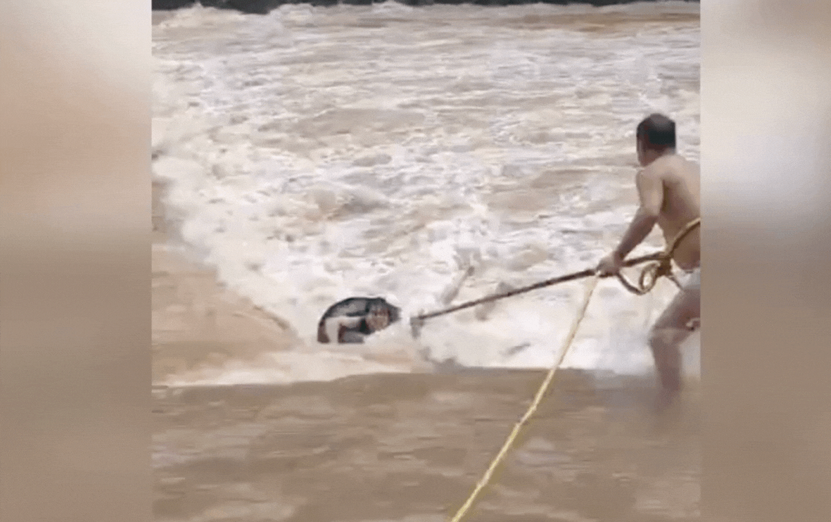 Sau vài giây căng thẳng tột độ, cuối cùng cây dài cũng tới tầm tay chàng trai. Với chút sức lực còn lại, anh cố bám thật chặt, trong khi mọi người trên bờ đồng loạt kéo dây, đưa cả hai vào bờ an toàn.