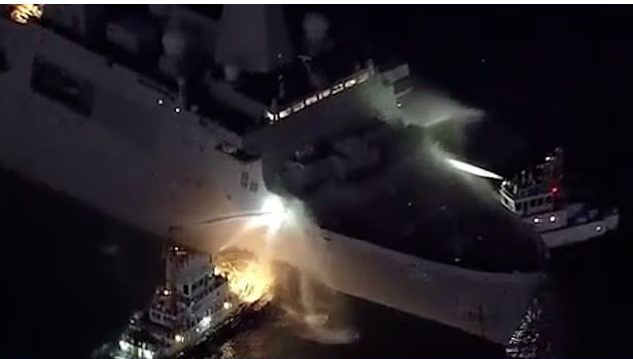 Các bên nỗ lực tìm cách dập tắt đám cháy trên tàu USS New Orleans. Ảnh: NHK