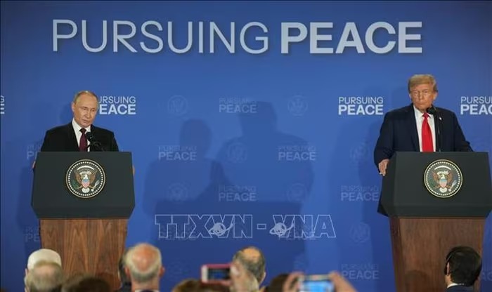 Tổng thống Mỹ Donald Trump (phải) và Tổng thống Nga Vladimir Putin tại cuộc họp báo chung ở Alaska, Mỹ, ngày 15-8-2025. Ảnh: TTXVN