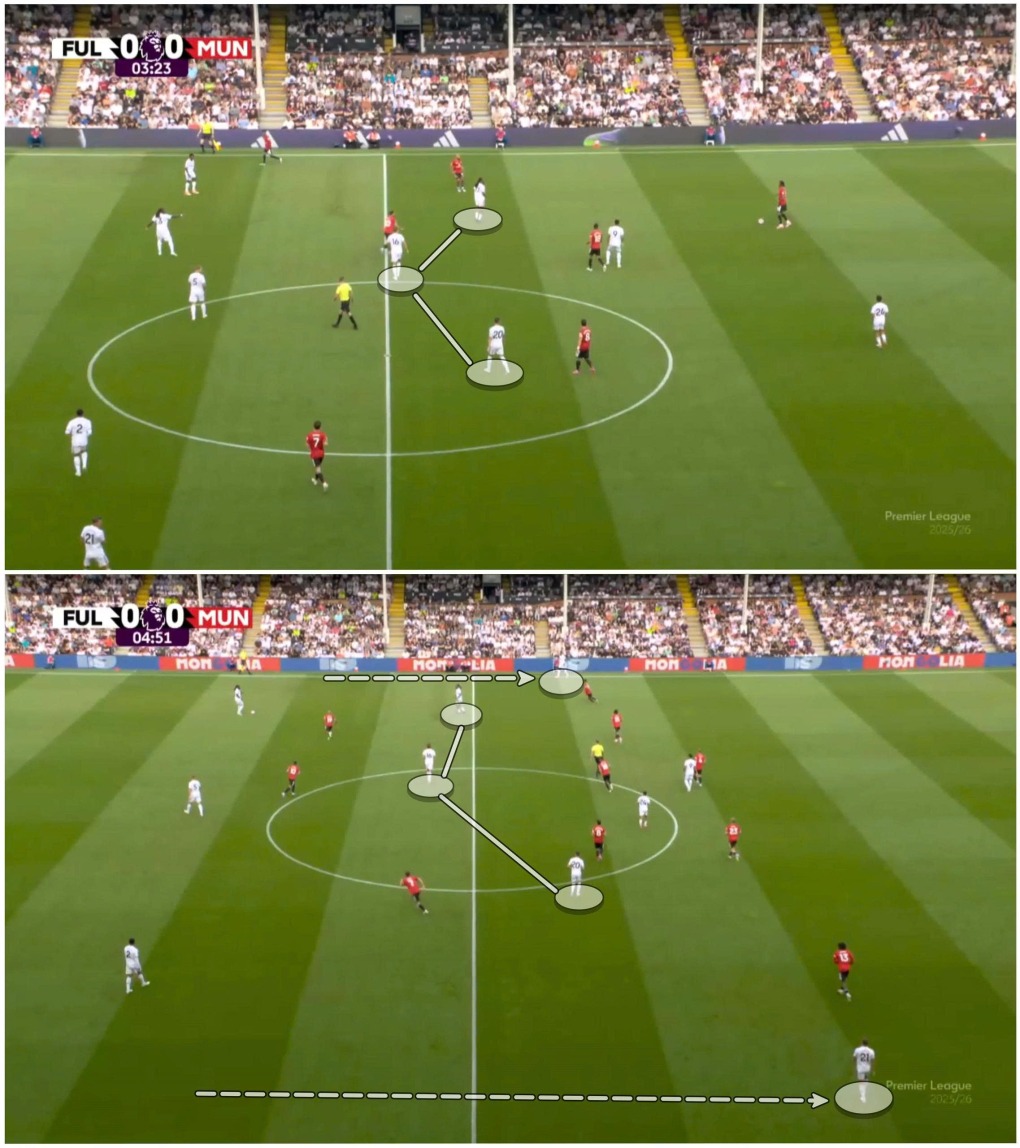 Mặt khác, với nhân sự đông người hơn ở tuyến giữa, chiến thuật của Silva là tìm cách áp đảo quân số trước cặp tiền vệ trung tâm của Man Utd, giúp Alex Iwobi – người được phép hoạt động ở nách trái trung lộ – trở thành nhân tố tự do trong tấn công và buộc trung vệ Leny Yoro phải dâng lên theo kèm thường xuyên. Khi hiệp hai dần trôi, Fulham bắt đầu kiểm soát tuyến giữa hoàn toàn, cả trận họa kiểm soát 52%.