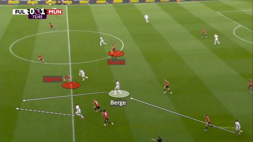 Fulham liên tục áp đảo hàng tiền vệ Man Utd - tuyến lần lượt được hợp bởi Fernandes và Casemiro, rồi Fernandes và Mason Mount, sau đó là Fernandes và Manuel Ugarte. Cặp tiền vệ trung tâm thay đổi suốt trận, nhưng lúc nào cũng có Fernandes hiện diện.
