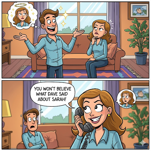 Một anh chồng muốn "dạy vợ khéo" nên đem vợ của ông bạn ra làm gương. Anh ta khen nức nở: nào là xinh đẹp, dịu dàng, đảm đang, nấu ăn ngon… đủ thứ mỹ từ. Vợ anh ban đầu có vẻ khó chịu, rồi im lặng ngồi suy nghĩ.