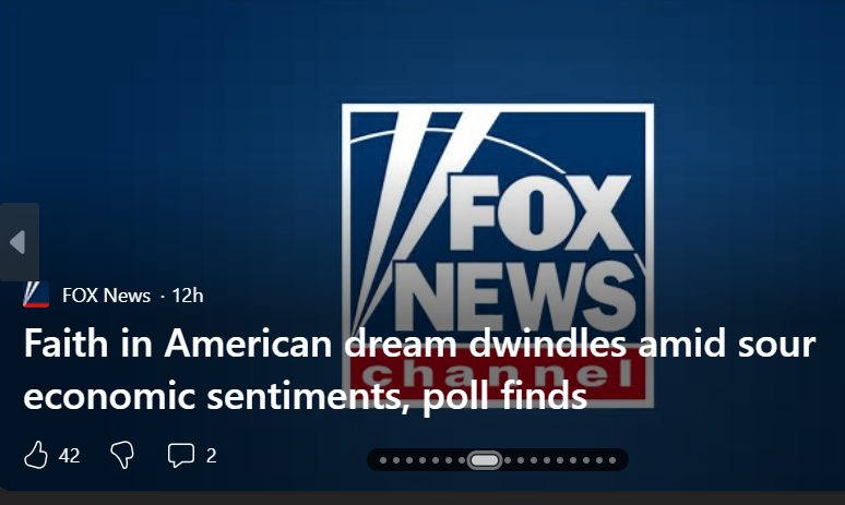 Một cuộc thăm dò gần đây của Wall Street Journal-NORC đối với người trưởng thành tại Hoa Kỳ cho thấy tâm lý bất ổn kinh tế lan rộng, với chỉ 31% cho biết họ nghĩ rằng "Giấc mơ Mỹ" - ​​rằng một người có thể thăng tiến bằng cách làm việc chăm chỉ - vẫn còn đúng.