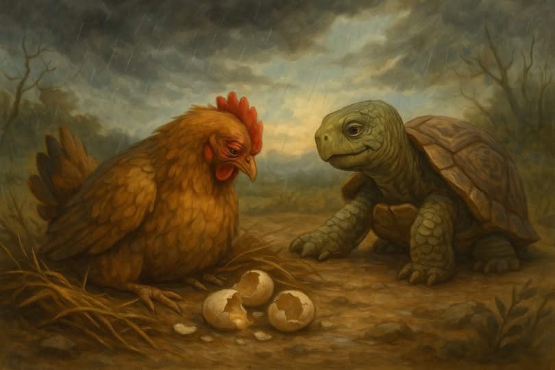 Đúng lúc đó, một con rùa già đi ngang. Thấy gà mái khóc, rùa dừng lại, dịu dàng hỏi:
