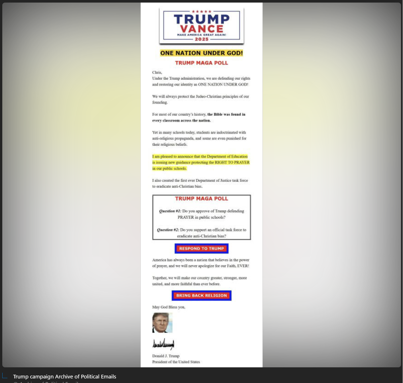 Một email gây quỹ gần đây từ Trump đặt trọng tâm chính trị của ông quanh đức tin, nhấn mạnh việc cầu nguyện trong các trường công lập và phản đối định kiến ​​chống Cơ đốc giáo. Thông điệp với chủ đề "Tôi luôn tin vào sức mạnh của lời cầu nguyện", nêu bật các sáng kiến ​​được cho là do chính quyền Trump thực hiện, bao gồm hướng dẫn mới của Bộ Giáo dục bảo vệ quyền cầu nguyện của học sinh và việc thành lập một lực lượng đặc nhiệm của Bộ Tư pháp nhằm giải quyết nạn phân biệt đối xử chống Cơ đốc giáo.