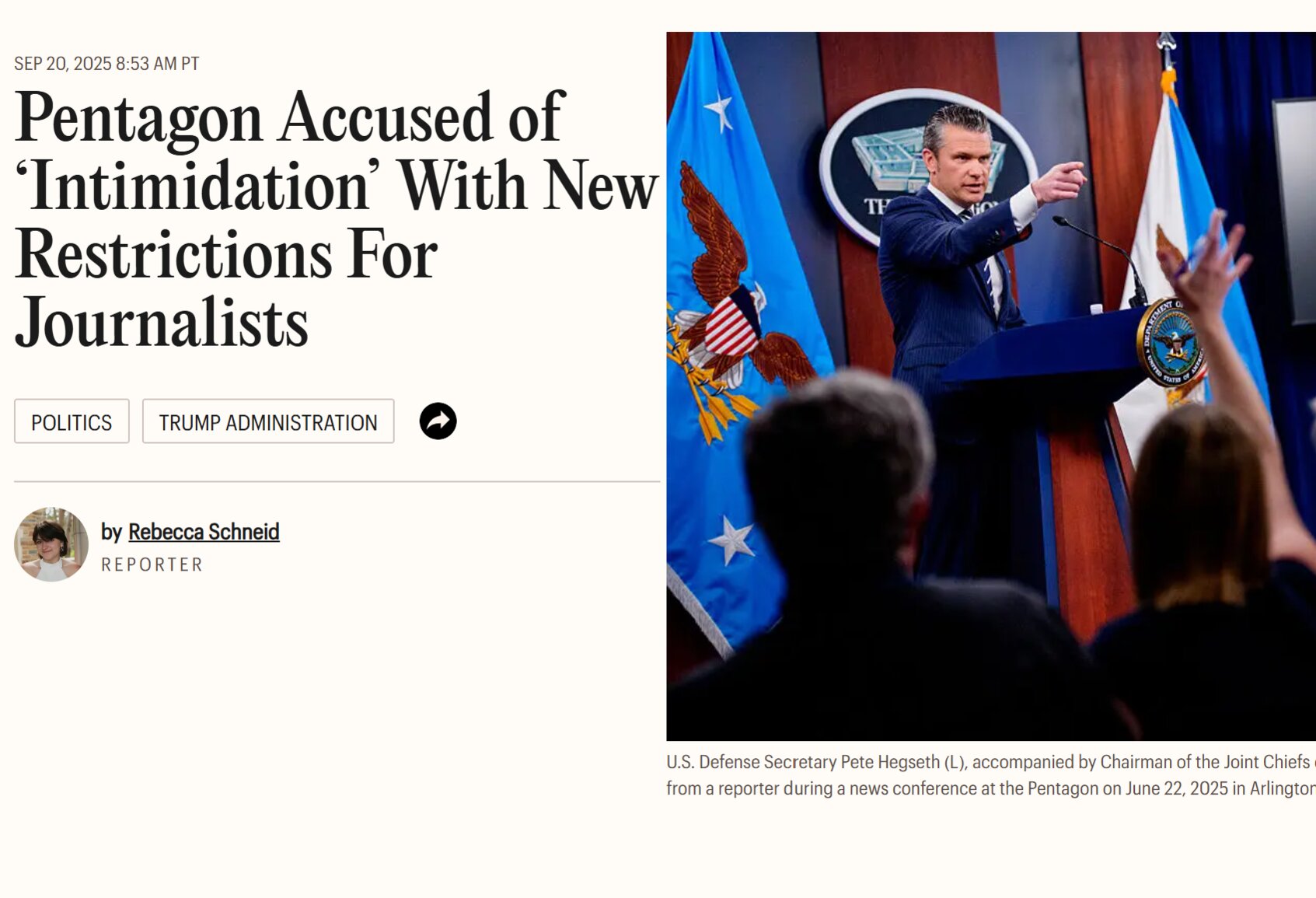 Đặc biệt, Lầu Năm Góc có mối quan hệ căng thẳng, nếu không muốn nói là đối kháng, với báo chí. Vào tháng 2, Hegseth đã thiết lập một “chương trình luân chuyển truyền thông hàng năm” mới, về cơ bản đã trục xuất một số tổ chức tin tức khỏi văn phòng Lầu Năm Góc, bao gồm NBC News, New York Times và National Public Radio (NPR), để luân chuyển sang các kênh truyền thông mới, bảo thủ, bao gồm One American Network, Newsmax và Breitbart, cũng như tờ báo cấp tiến hơn là HuffPost.