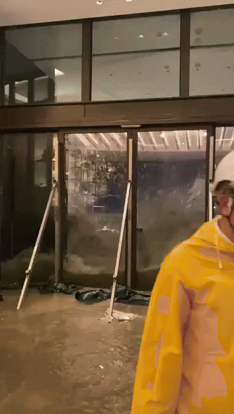 Khoảnh khắc nước lũ đánh sập cửa kính của khách sạn tại Hong Kong sáng 24/9. Ảnh cắt từ clip.