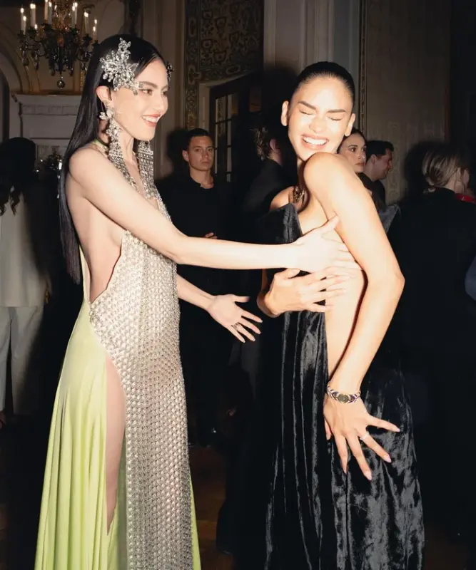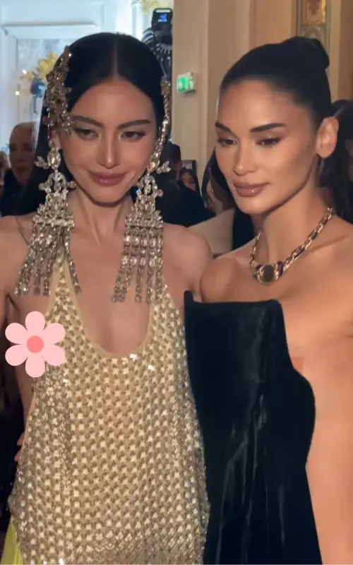 Hai sao nữ đình đám tự tin mặc mốt không nội y khi đi dự sự kiện, Pia Wurtzbach vô tình để lộ miếng dán ngực khi chụp hình cùng Mai Davika. Ảnh: TikTok Nhân vật