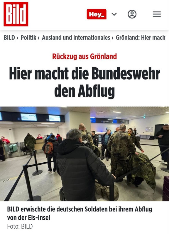 Tờ Bild của Đức đưa tin rằng chưa đầy 44 giờ sau khi binh lính Đức đổ bộ xuống Greenland "để thể hiện sự hiện diện" trước những lời đe dọa của Tổng thống Trump, họ đã nhận được lệnh rời khỏi Greenland mà không có lời giải thích nào sau khi Tổng thống Trump tuyên bố áp thuế đối với các quốc gia châu Âu để trả đũa. Thật nực cười!