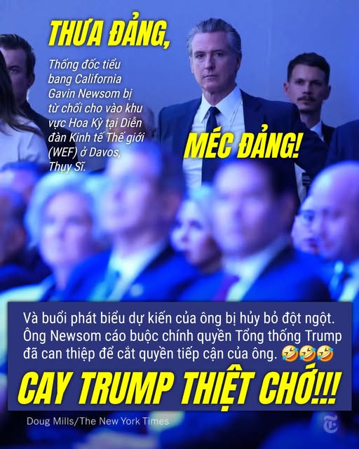 Nó chế giễu Newsom vì bị mắc kẹt trong "chiếc ghế góc" khi Trump phát biểu tại Davos. Thật là đau lòng.