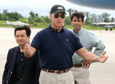 Joseph Cao (trái) đón Phó tổng thống Mỹ Joe Biden (giữa) tại sân bay quốc tế Louis Amstrong. Ảnh: Times Picayune.