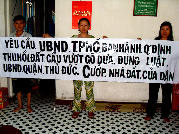 Theo báo chí nhà nước (Người cao tuổi, Thanh tra…) thì việc giải phóng mặt bằng nơi đây là “bạo ngược”, chứ không theo qui định của pháp luật. Cán bộ “đi đêm” để trả tiền bồi thường cho dân. Phó chủ tịch quận Thủ Đức Lê Văn Lộc “ăn” hàng ngàn mét vuộng đất của dân và ông ta thích bồi thường cho ai bao nhiêu là tùy sự ngẫu hứng của ông. Nay chủ tịch quận Thủ Đức Trương Văn Thống lại còn hung bạo hơn Lê Văn Lộc, vì đã có Lê Thanh Hải, Lê Hoàng Quân và Nguyễn Văn Đua bảo kê. Đại hội đảng xong rồi, chính quyền thành Hồ thẳng tay cướp nhà, đất của dân nghèo. Người dân không còn nghĩ gì tới tết cổ truyền dân tộc, khi họ thấy lệnh cưỡng chế dán trên cửa nhà mình.