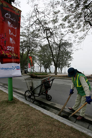 Đường Thanh Niên lúc 9 giờ sáng vẫn vắng tanh, một vài lao công cần mẫn dọn sạch rác từ năm trước để lại.